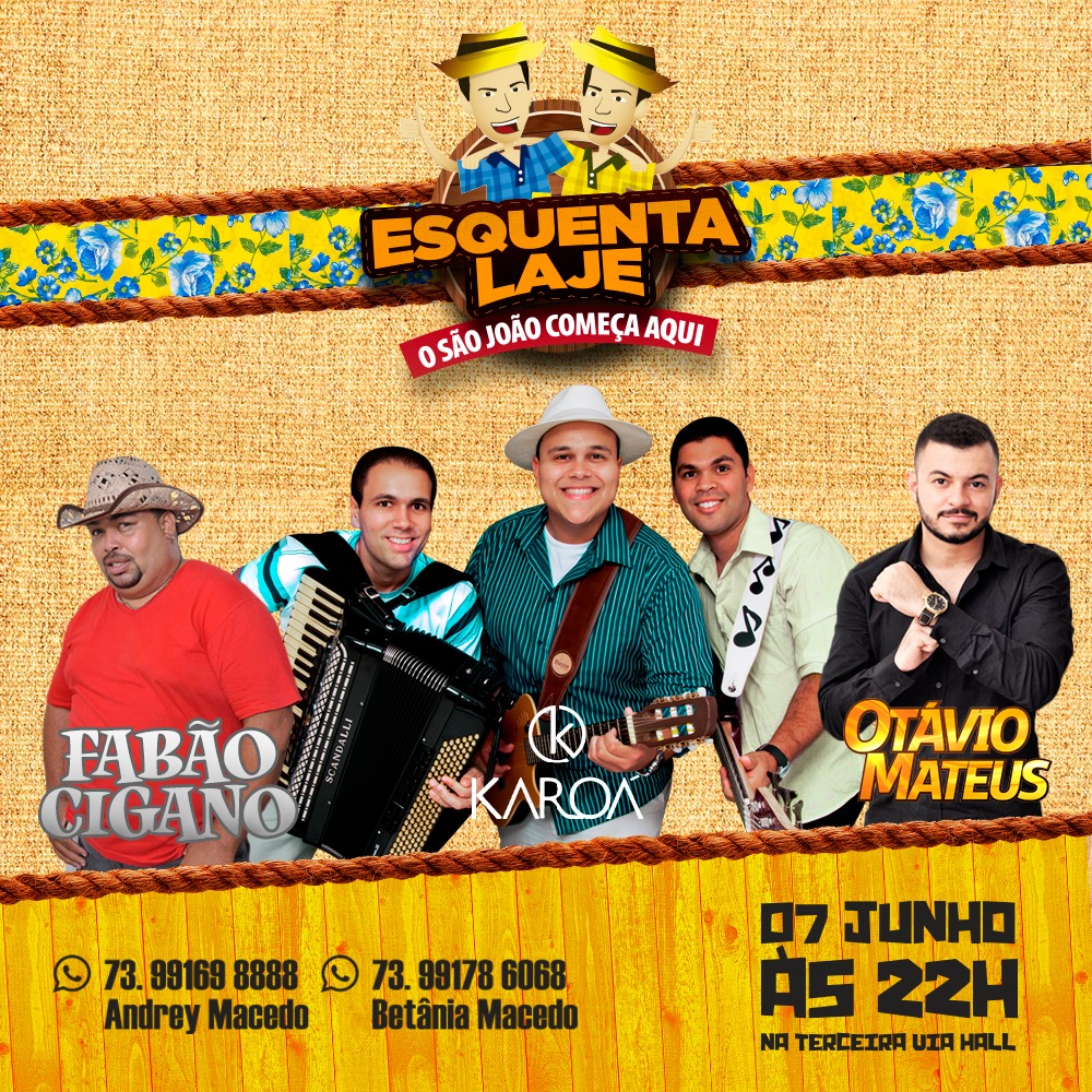 Aberta a temporada dos forrós vem aí o Foot 7, dia 7 de junho ali na saída para Ilhéus. O Cola na Manu, dia 24 no São Judas Tadeu. O Esquenta Ibicuí numa parceria do Tarik Club com o Ticomia, dia 30; e o Esquenta Laje, dia 7 na Terceira Via Hall.