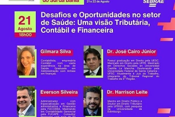 Com o tema “Desafios e oportunidades no setor de saúde – Uma visão tributária, contábil e financeira”. nesta quarta e quinta-feira (às 17 horas), o Sebrae através do Programa Revigora Saúde, promove o 1º Encontro dos Profissionais da Saúde do Sul da Bahia, no Centro de Cultura em Itabuna. O evento é gratuito, está com inscrições abertas, mas as vagas são limitadas. Para participar, basta acessar o link (https://bit.ly/encontrosaudeITB). Informações podem ser obtidas por telefone através do número (73) 99981-1688. Desafios e oportunidades no setor de saúde – Uma visão tributária, contábil e financeira”.