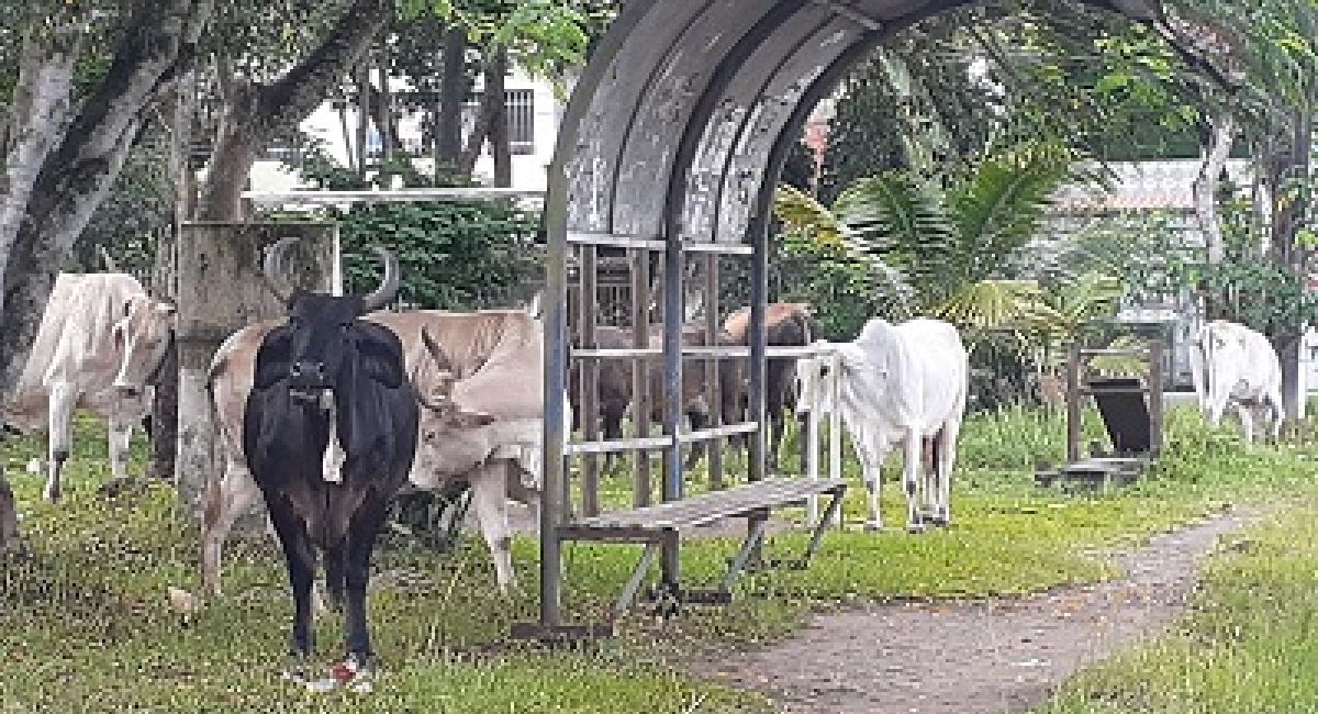 Enquanto os serviços de manutenção não chegam as vaquinhas pastam tranquilamente num ponto de ônibus no Jardim Primavera