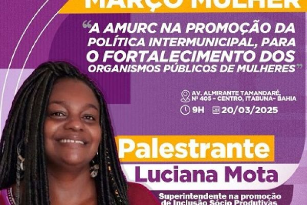 Em comemoração ao mês da mulher, a AMURC, através da Sala Lilás, estará promovendo um Encontro com Gestoras de Assistência Social e de Organismos Públicos de Mulheres, nesta quinta-feira (dia 20), às 9 horas, na sede da Associação, com a presença da Superintendente da Promoção de Inclusão Sócio Produtiva das Mulheres da SPM/BA, Luciana Mota.