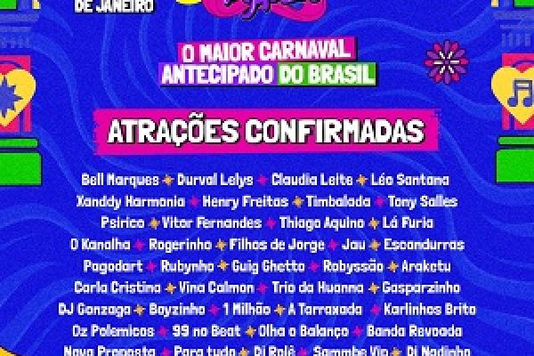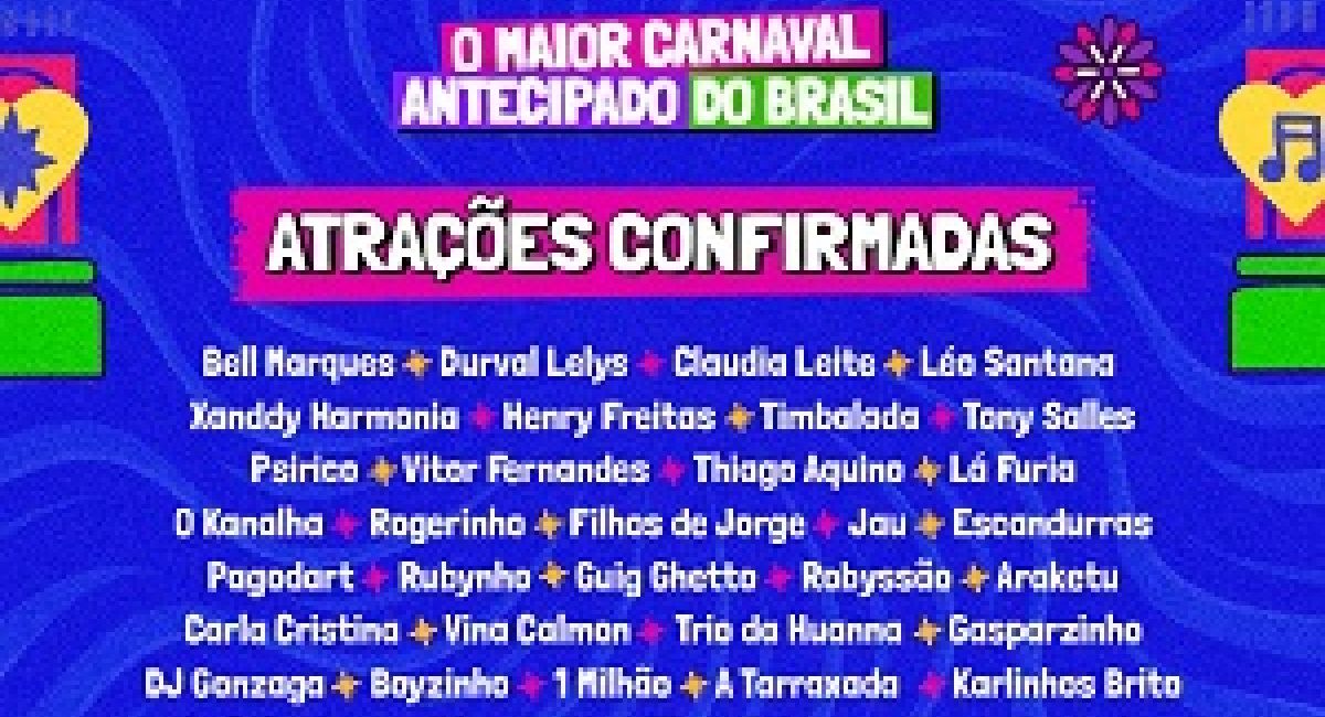 A grade das atrações já está confirmada, com destaque para Bell Marques, Durval Lelys, Cláudia Leitte, Léo Santana, Xanddy Harmonia, Timbalada, Tony Salles, Psirico, Lá Fúria, O Kanalha, Escandurras, Trio da Huanna, Araketu e Guig Ghetto, dentre outras.