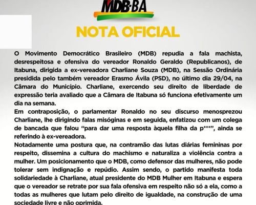 MDB DIVULGA NOTA OFICIAL DE REPÚDIO À FALA OFENSIVA CONTRA EX-VEREADORA